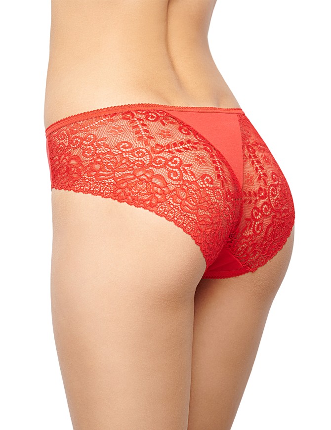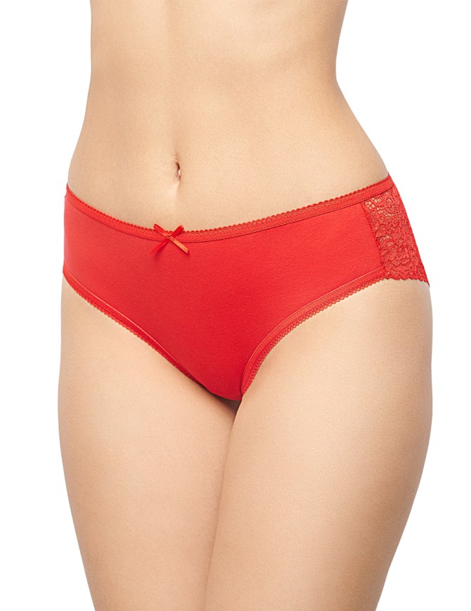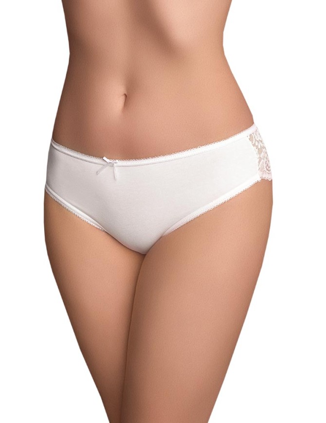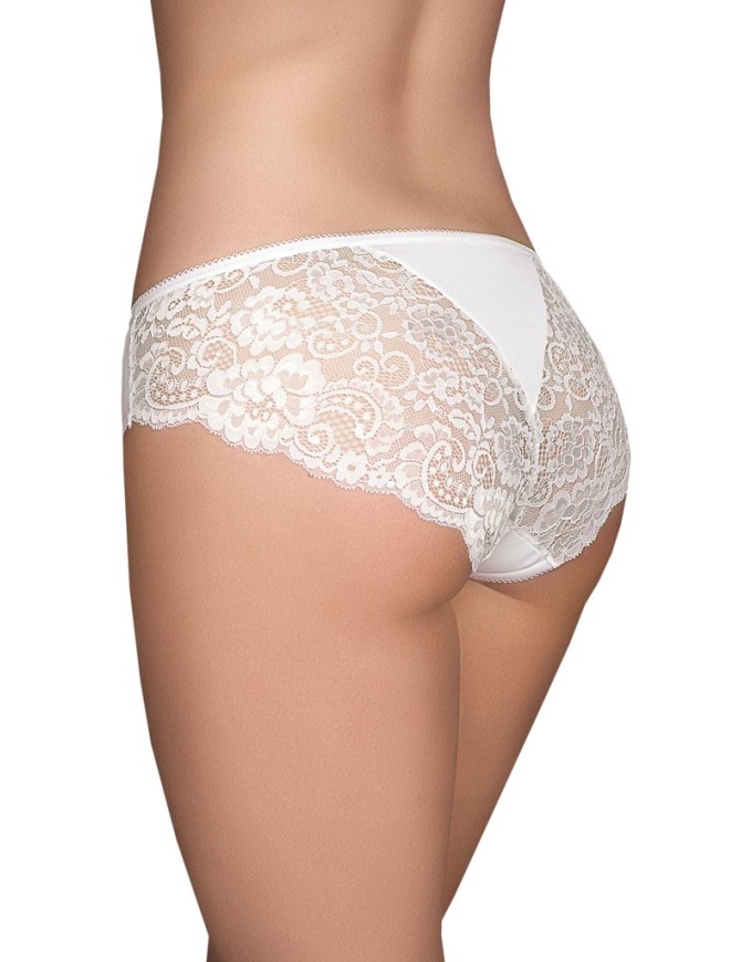 Трусы классические со средней посадкой. Передняя деталь из хлопка. Задняя деталь кружевная, с треугольной хлопковой вставкой. Пояс обработан эластичной тесьмой. За счёт ажурных нижних срезов на задней детали модель прекрасно подходит под облегающую одежду