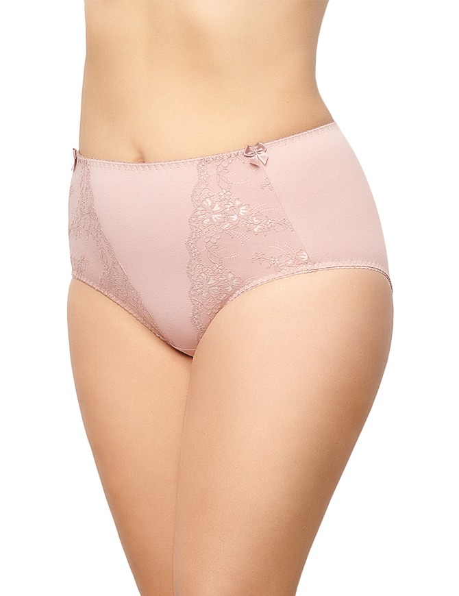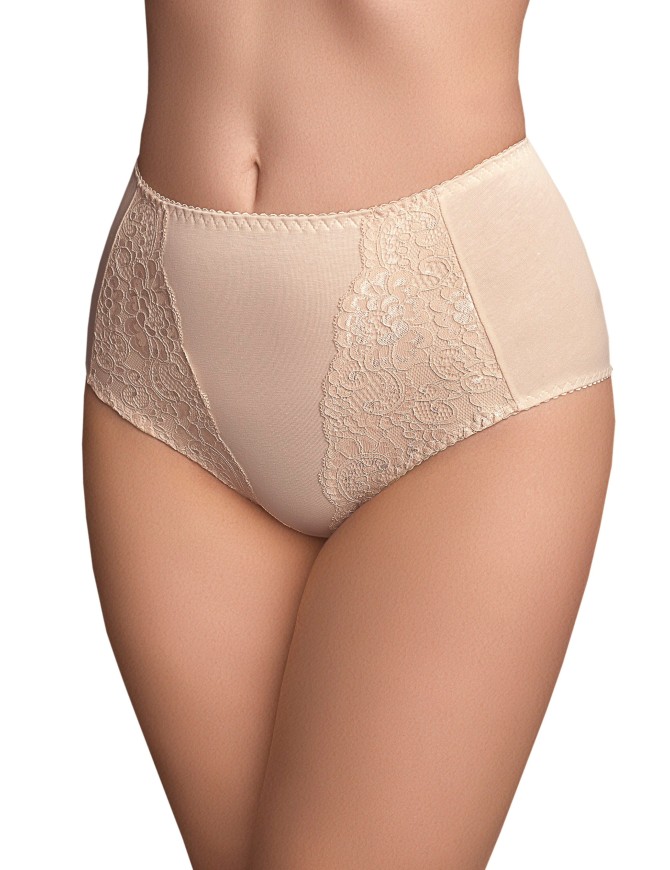 Трусы с высокой посадкой. Передняя деталь декорирована кружевными вставками, настроченными на трикотажное полотно, для надёжности и комфорта. Боковой шов смещён на переднюю деталь. Срезы обработаны швом "зигзаг". Задняя деталь полностью из хлопка.