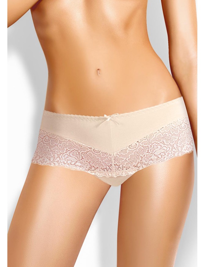 Трусы шорты из хлопкового полотна с добавлением эластана комфортной посадки. На детали переда и спинки широкое кружево. По поясу и ножке резинка с фестоном.