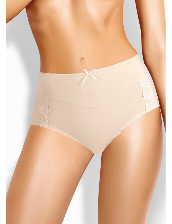 Трусы-макси женские из плотного эластичного хлопкового полотна. Обработка краев - ажурная резинка с фестоном. По бокам вставки из кружева. По переду бант.