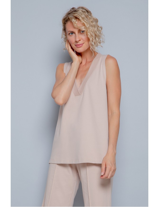Бежевый жилет с V-образной горловиной. Материал изделия - эластичный футер петля со спандексом. Украшен металлической подвеской с фирменным тиснением VN на полочке. Спинка удлинена, по бокам разрезы. Низ и проймы обработаны плоскими швами.