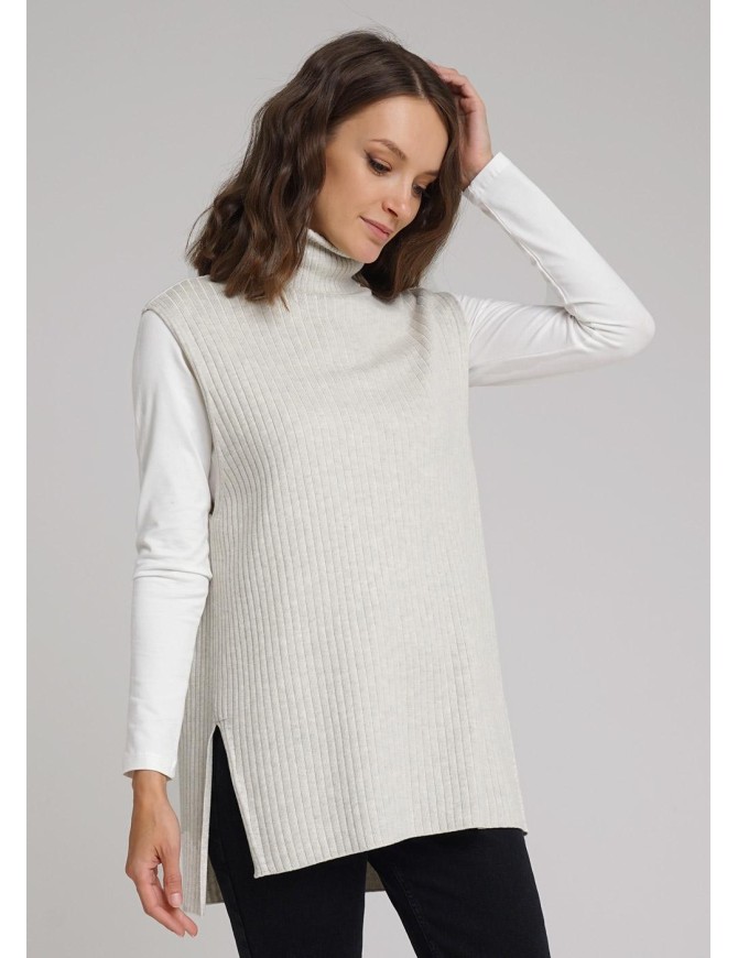 Жилет без рукавов из хлопковой пряжи с добавлением акрила. Горловина- стойка с отворотом. Ассиметричная длина, по бокам разрезы.