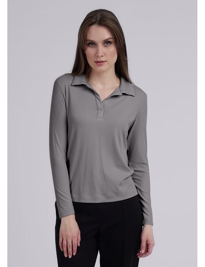 Малообъемный джемпер из трикотажного полотна кашкорсе. Отложной воротник, декоративная планка. Втачной длинный рукав.