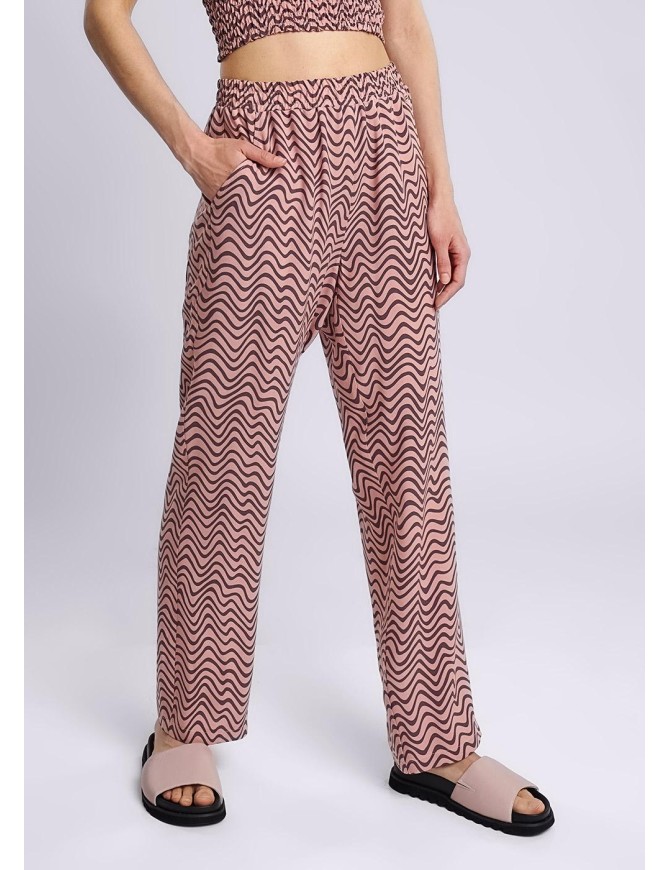 Брюки из штапеля прямого кроя. Притачной пояс на внутренней резинке. По бокам карманы. Завершает дизайн жаккардовая нашивка.