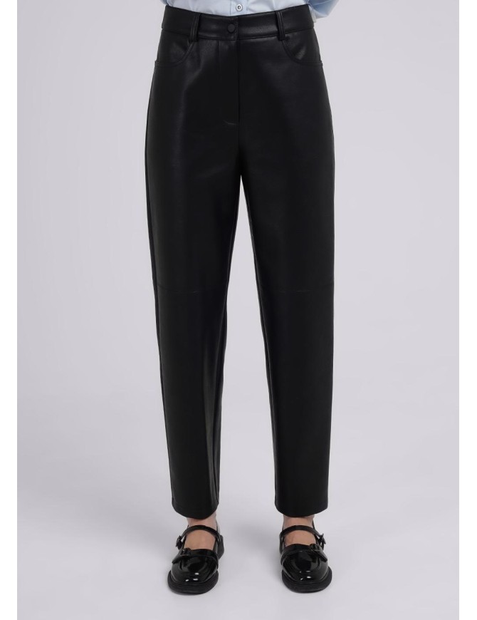 Брюки из искусственной кожи, зауженные книзу. Притачной пояс со шлевками, по переду гульфик с застежкой на молнию и кнопку. Боковые карманы с отрезным бочком, хольнитены. По спинке кокетка, накладные карманы. По линии колена горизонтальные резы.