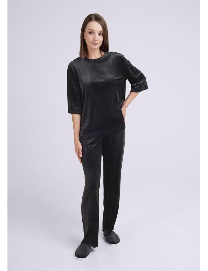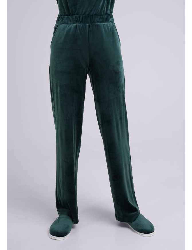 Женские брюки для дома выполнены из материала велюр. Благодаря высокой посадке модель удобна в носке и подойдет для любого типа фигуры. Брюки подходят в качестве домашней одежды, а также для прогулок и отдыха.