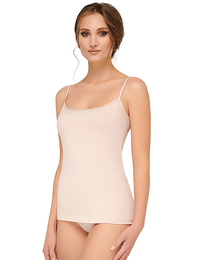 Майка женская на тонких бретелях. Бретели визуально облегчают модель, что позволяет носить ее как самостоятельную вещь летом, так и в период межсезонья под жакеты и кардиганы.