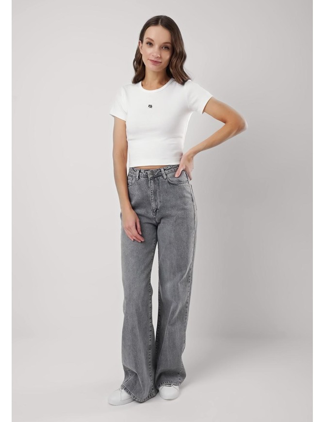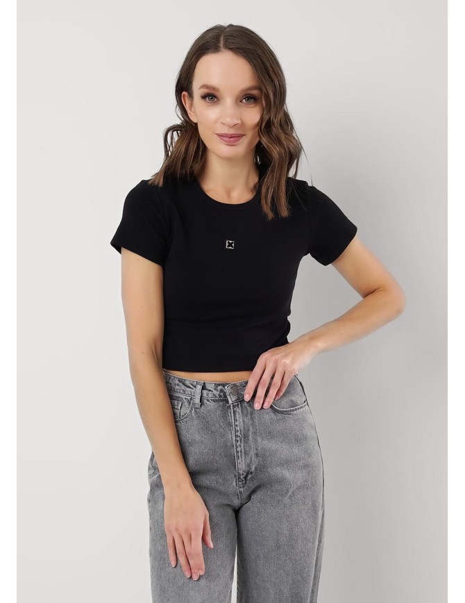 Футболка укороченная, прилегающего силуэта из хлопкового трикотажного полотна с эластаном- рибана. Округлый вырез горловины с окантовкой. Короткий втачной рукав. Спереди нашивка.