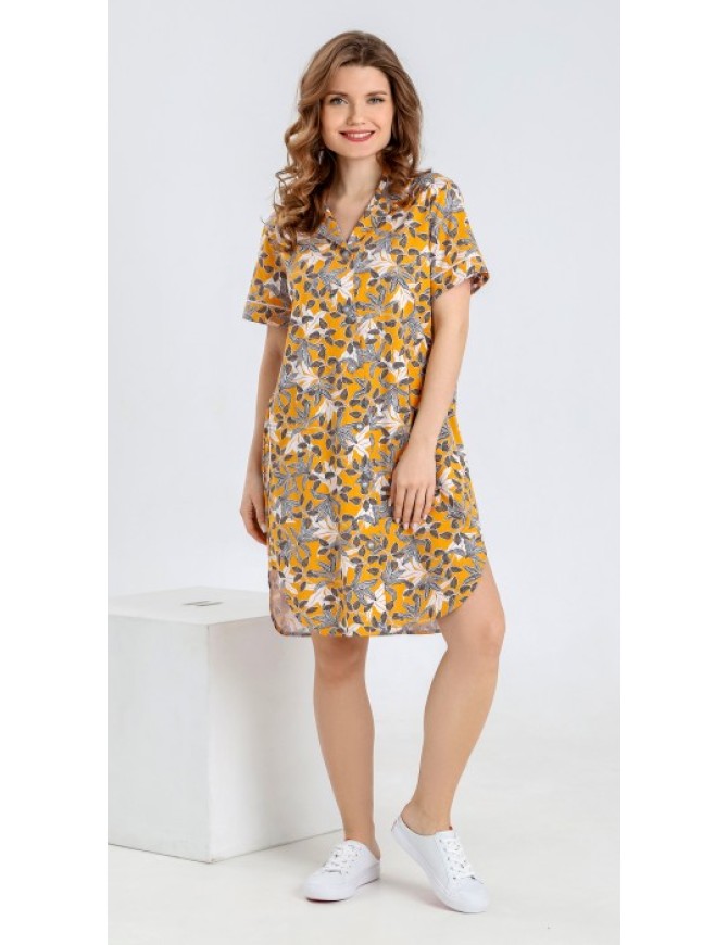 Халат из трикотажного полотна «кулирка» с набивным рисунком, прямого силуэта, с короткими втачными рукавами, стояче-отложным воротником, карманами в боковых швах и центральной бортовой застежкой на петли и пуговицы и фигурной линией низа. Входы в карманы обработаны двойным кантом. Низ рукавов – с притачными манжетами и узким кантом контрастного цвета в соединительных швах.