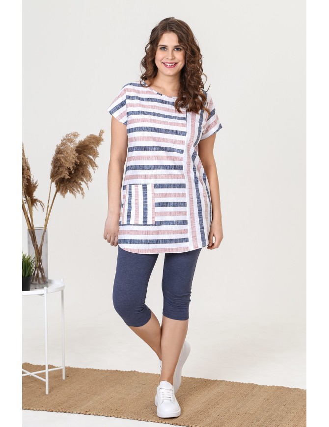 Футболка – удлиненная, с короткими цельнокроеными рукавами, горловиной овальной формы, окантованной основным материалом и фигурным низом. Полочка – из двух частей, выкроенных с разным направлением полоски. В нижней части правой детали пояса обработан накладной карман прямоугольной формы.