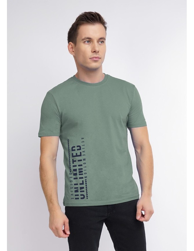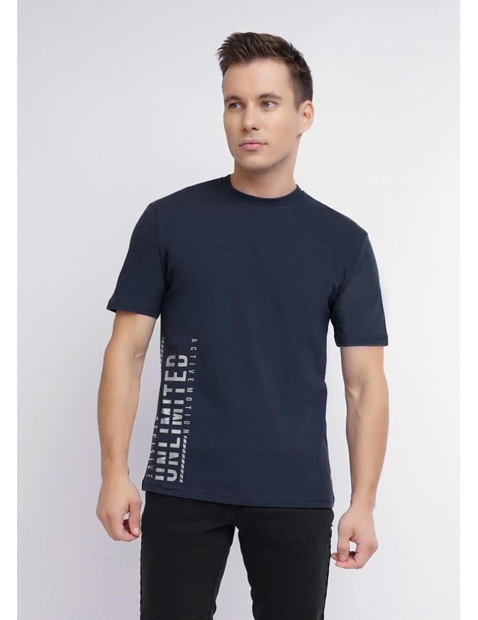 Фуфайка с коротким рукавом среднего объема, с оригинальным принтом, круглым вырезом горловины, которая оформлена обтачкой из рибаны.