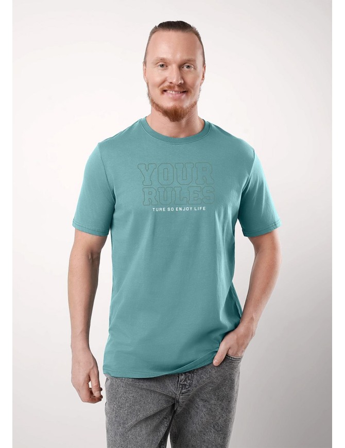 Футболка свободного кроя с круглым вырезом горловины и коротким рукавом. Модель выполнена из трикотажного хлопкового полотна. Изделие дополнено дизайнерским принтом и имиджевой фурнитурой. Универсальная вещь мужского гардероба на каждый день.