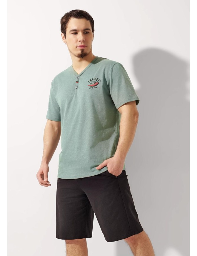 Набор мужской для дома: футболка из хлопкового полотна флам с фигурной горловиной с иммитацией планки с дизайнерским принтом. Шорты из трикотажного полотна на широком поясе с резинкой и регулируемым шнуром, по бокам удобные карманы.