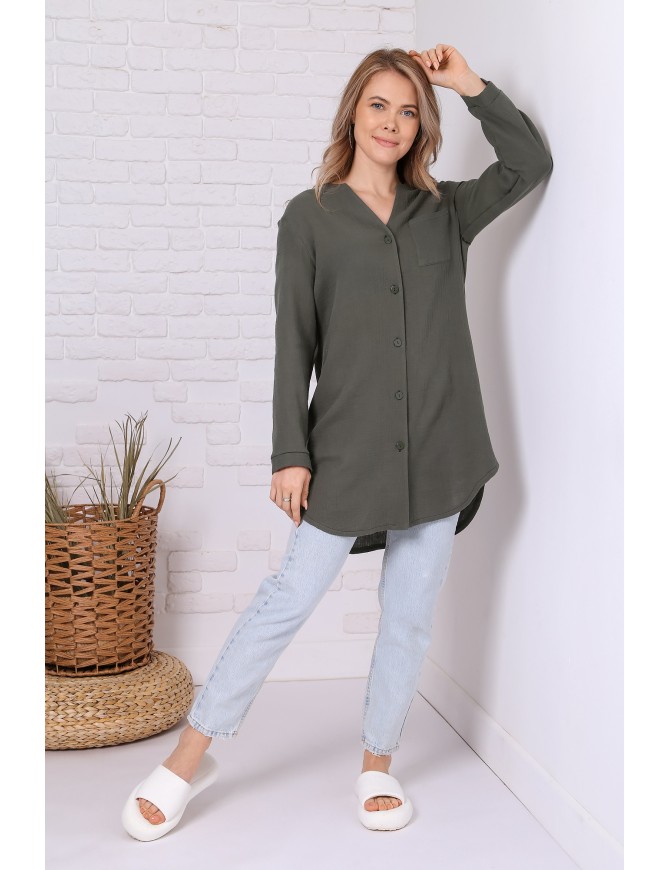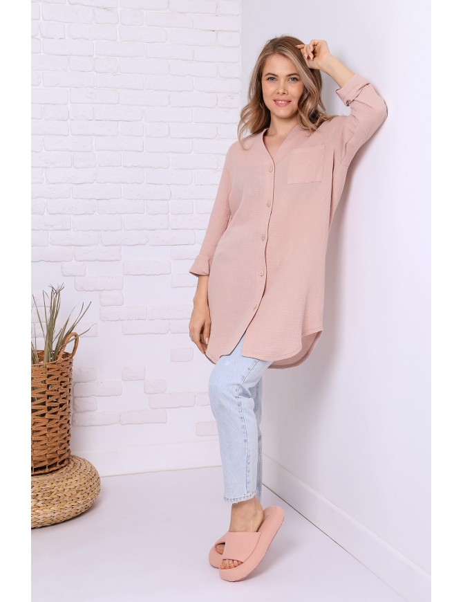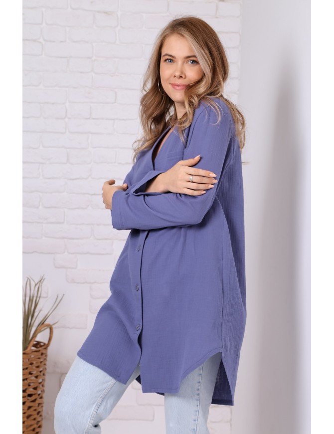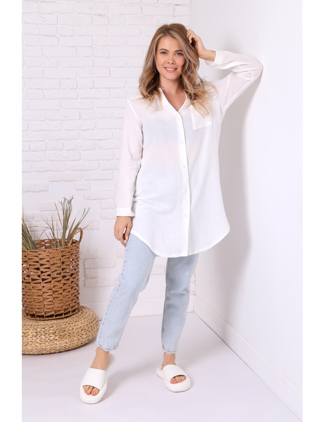 Туника женская из фактурной х/б ткани. Модель со слегка спущенной линией плеч, фигурными линиями горловины и низа, нагрудным карманом, с кокеткой и встречной складкой на спинке, с центральной ботовой застежкой на петли и пуговицы.
