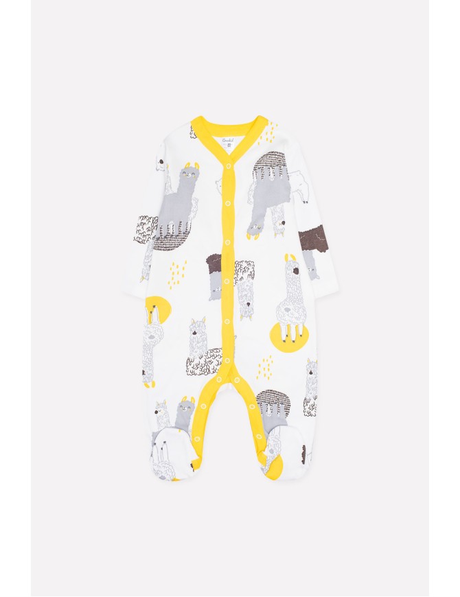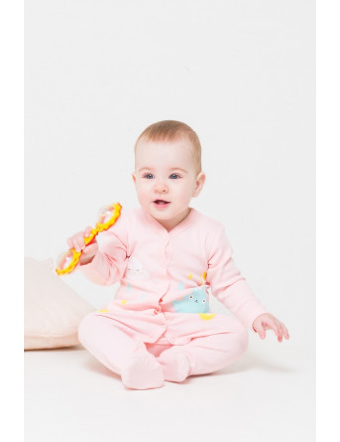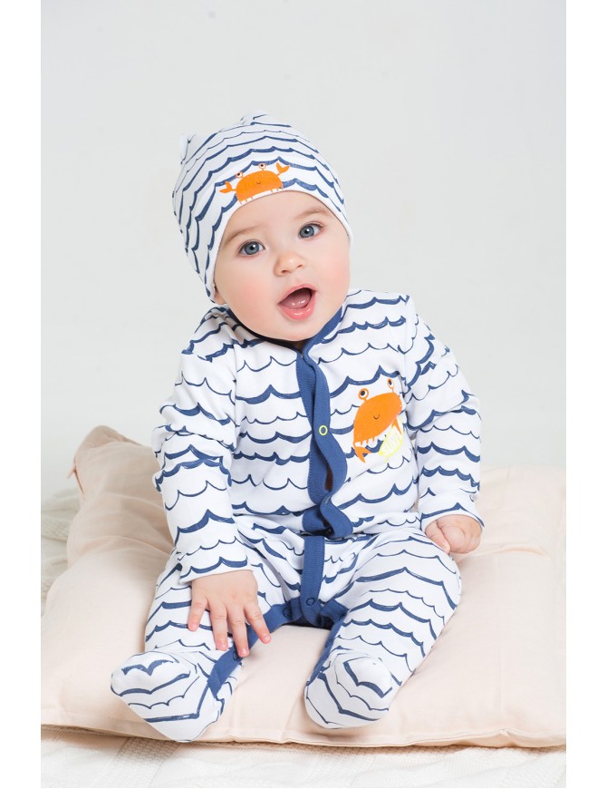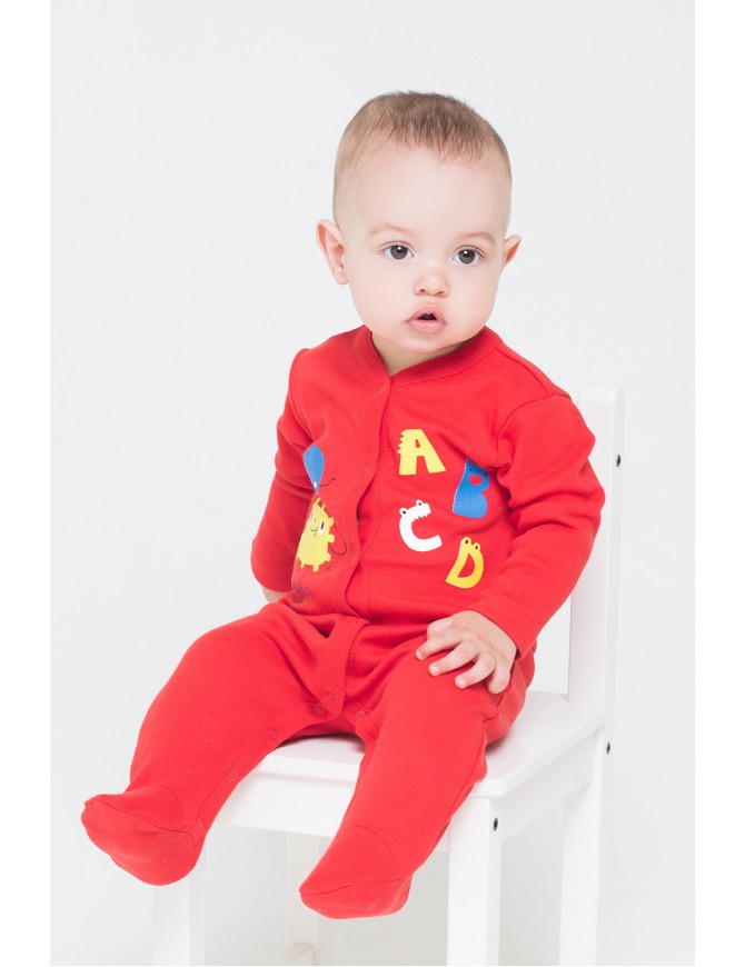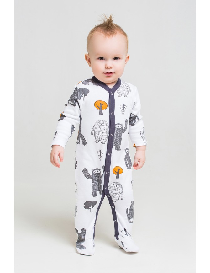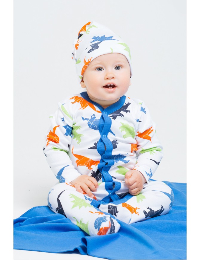 Детский комбинезон из трикотажного хлопка. Застежка на кнопки по центру и шаговому шву. В размере 36/56 предусмотрены варежки-антицарапки по низу рукава, и изделие выполнено швами наружу.