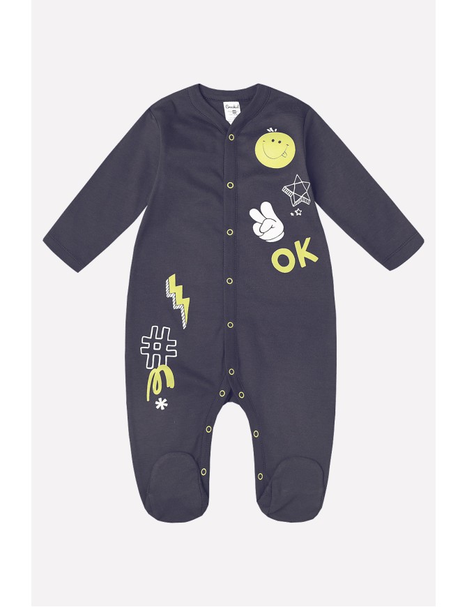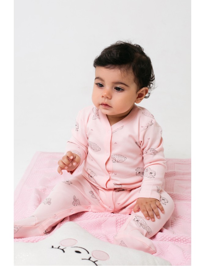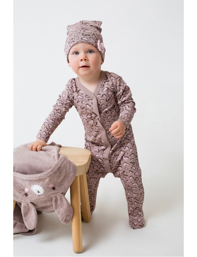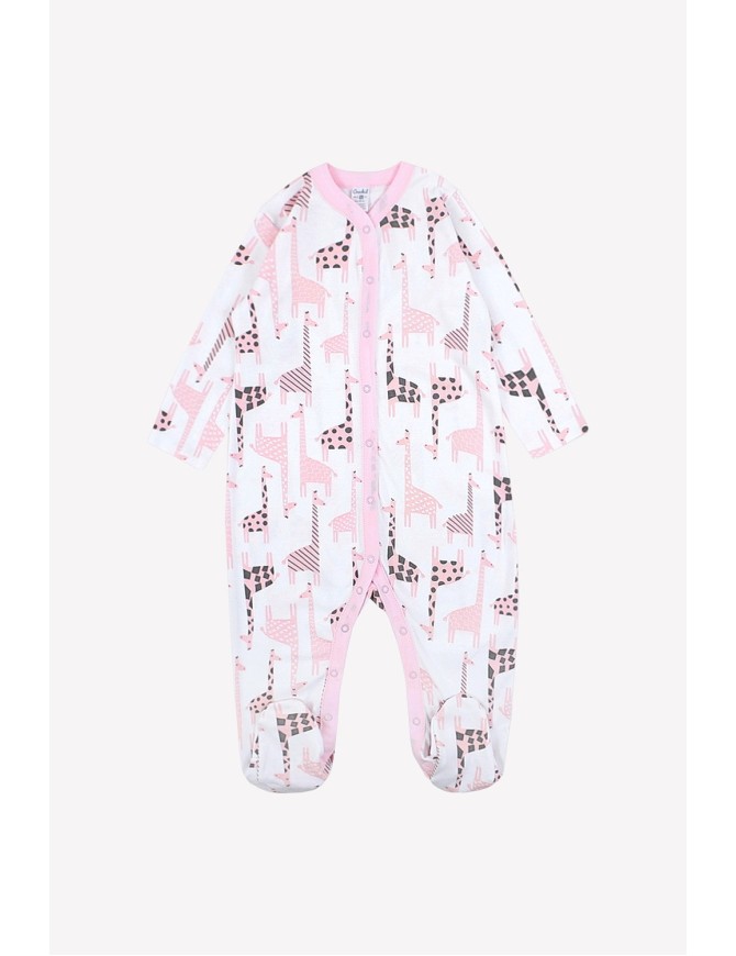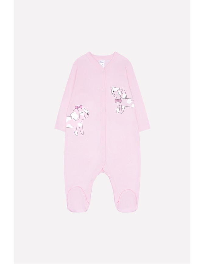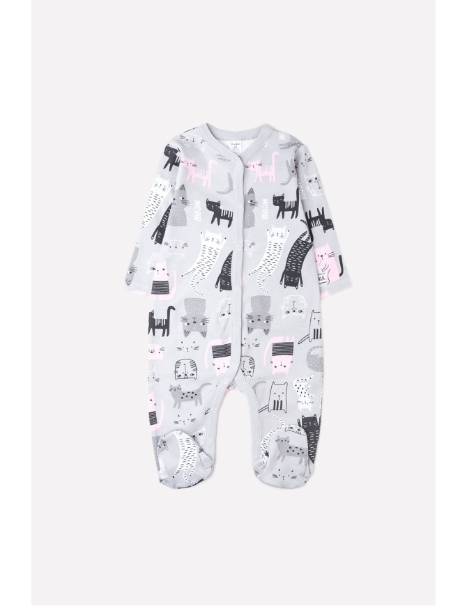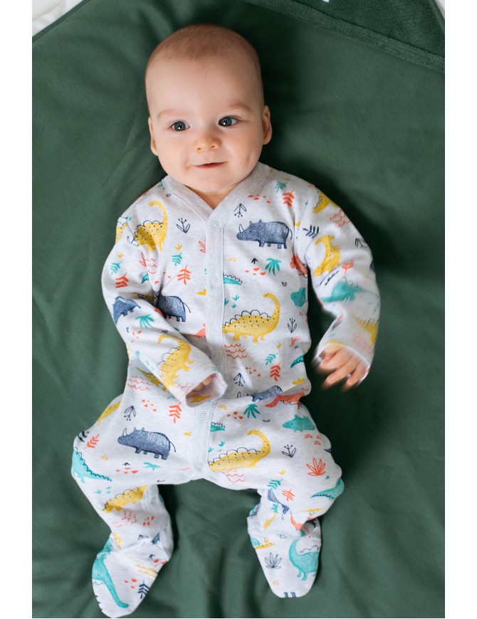 Детский комбинезон из трикотажного хлопка. Застежка на кнопки по центру и шаговому шву. В размере 36/56 предусмотрены варежки-антицарапки по низу рукава, и изделие выполнено швами наружу.