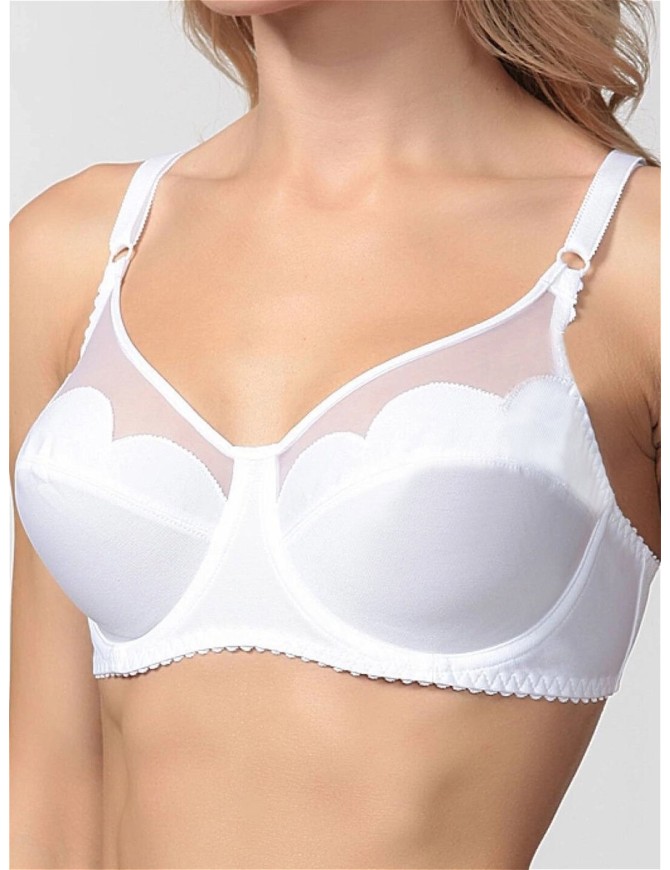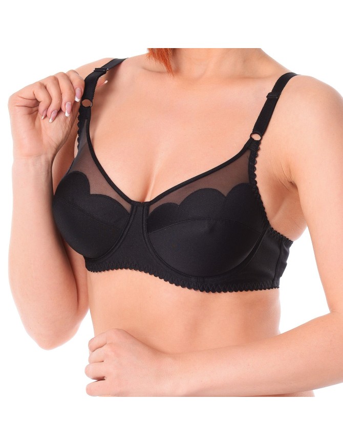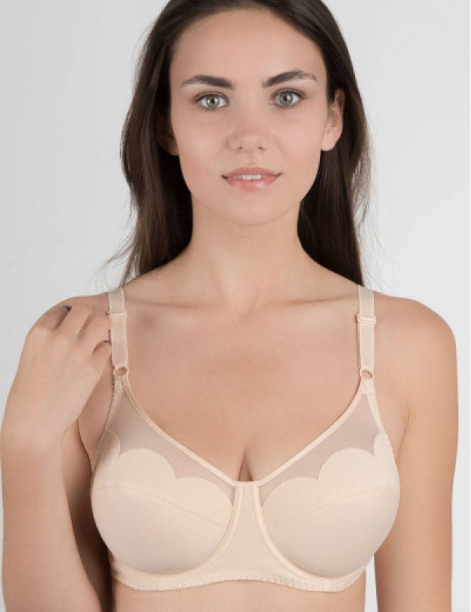 Бюстгальтер с мягкими чашками. Стильный, современный дизайн - отличительная черта этой модели. Оригинальная верхняя часть чашек с уникальной отделкой в виде лепестков. Чашки с двойным членением на каркасах. Нижняя и боковые линии модели также выполнены с интересной отделкой. Широкая спинка, застежка на двух крючках.