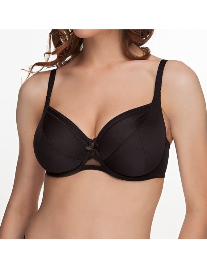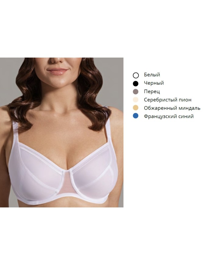 Бюстгальтер из неэластичного трикотажного и эластичного полотна, на каркасах, с мягкой чашкой.