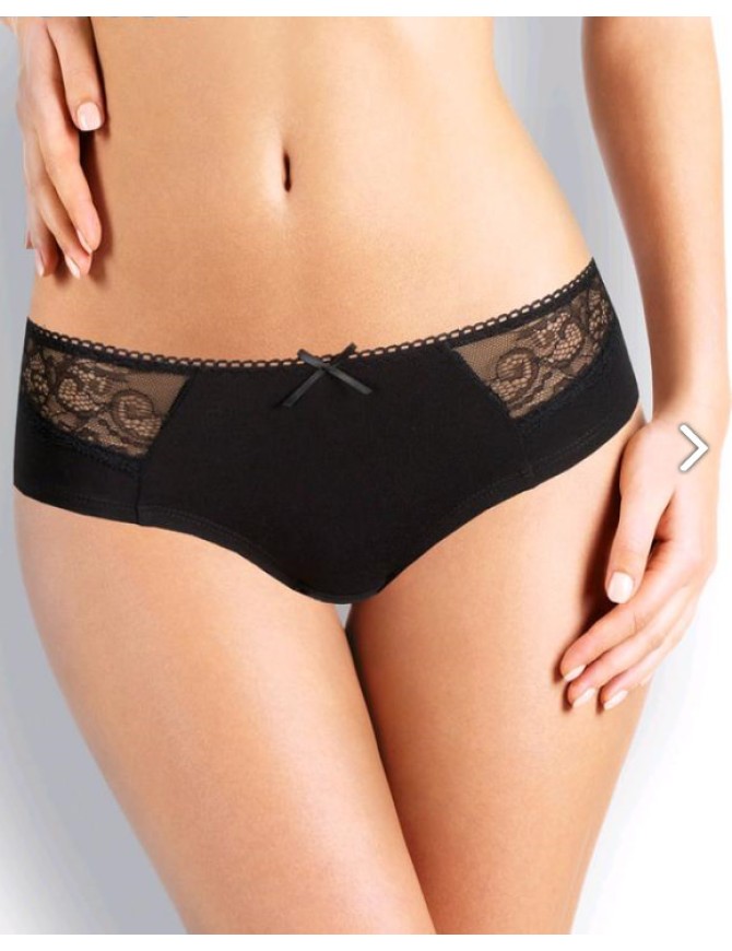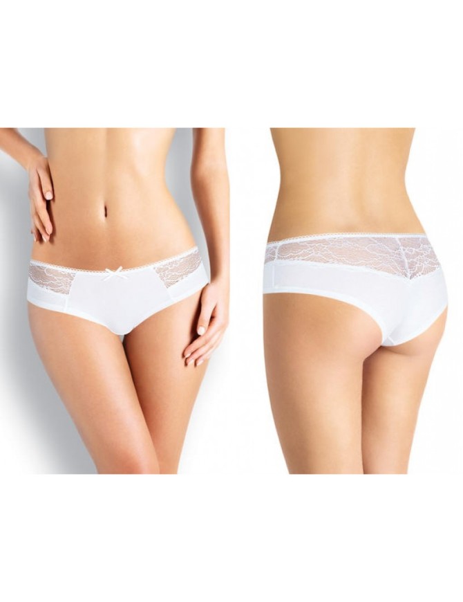 шорты комфортной посадки. Изделие имеет комбинированные с кружевом отрезной бочок и деталь спинки. По талии выполнена обработка резинкой с фестоном. Завершает дизайн небольшой атласный бант на детали переда.