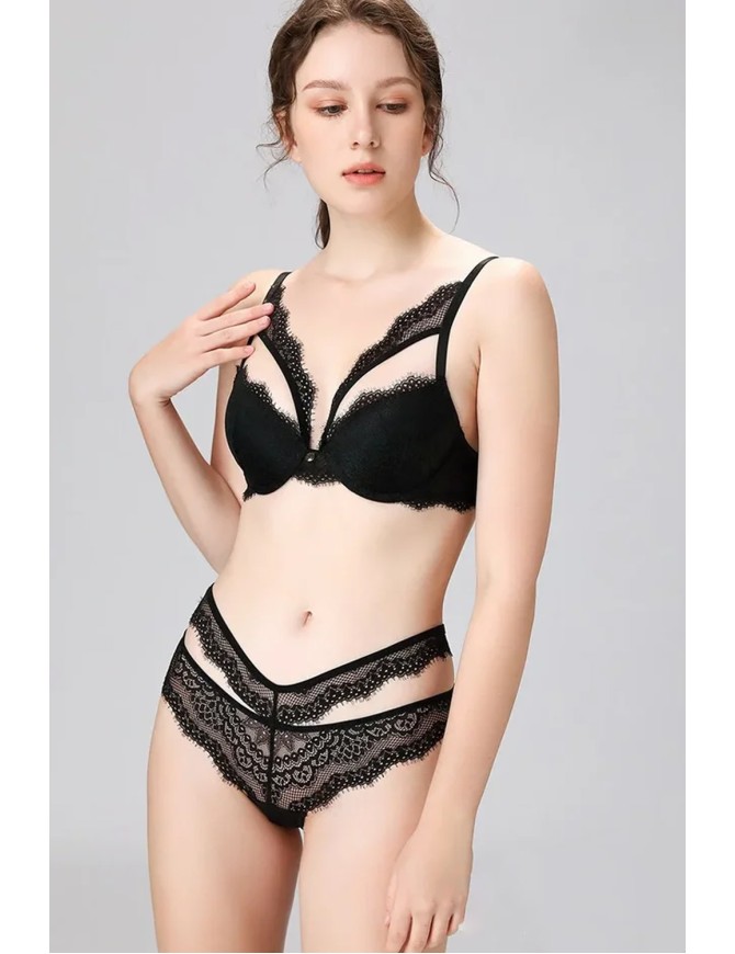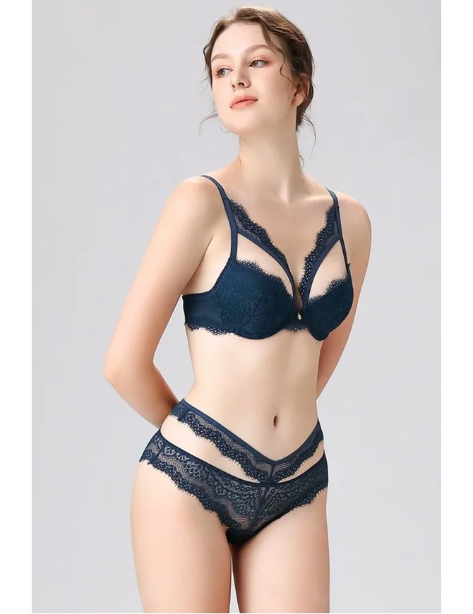 Комплект нижнего белья выполнен из кружева. Бюстгальтер с уплотненной чашкой, с косточками, украшен декоративными несъемными кружевными стропами. Трусы слипы, средней посадки, украшены декоративными несъемными кружевными стропами.
