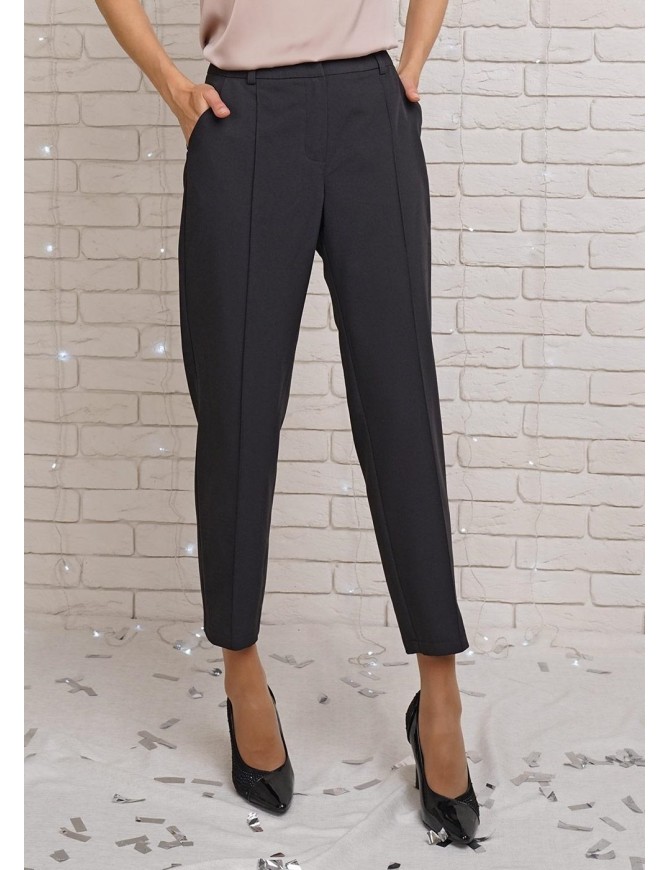 Прямые брюки из габардина со стрелками. По талии притачной пояс со шлёвками. Застёжка на молнию и крючок. По бокам функциональные карманы в отрезном бочке.