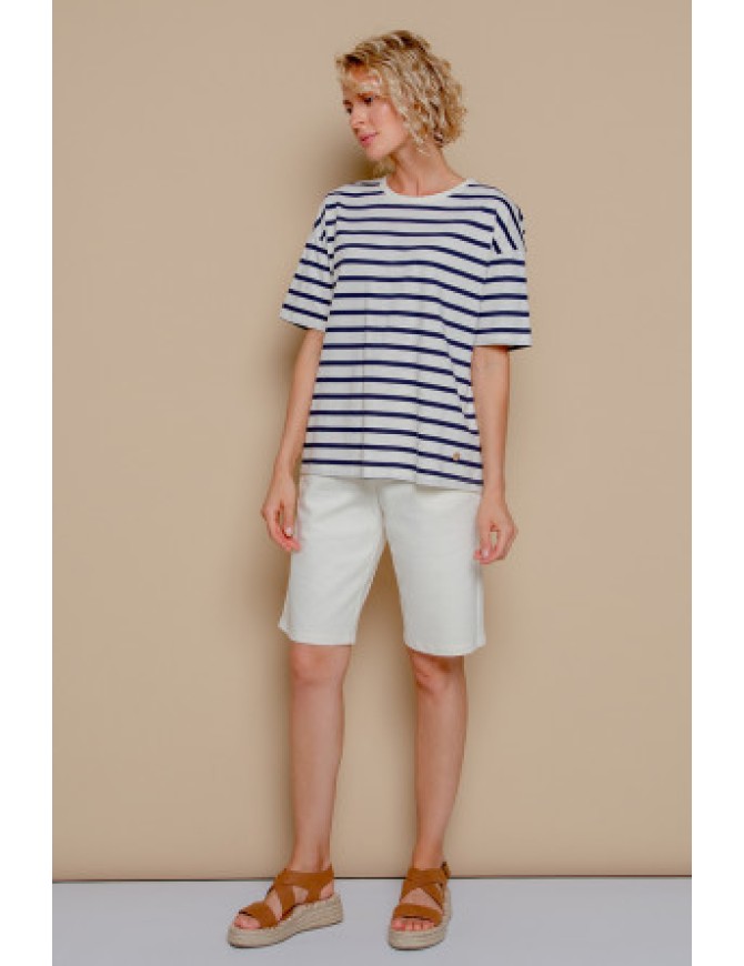 Удлинённые шорты с карманами из однотонного хлопкового трикотажа. Материал изделия - белый футер петля с эффектом слаб. Пояс на резинке регулируется при помощи плетёного шнурка. По бокам карманы. Низ обработан плоскими швами.