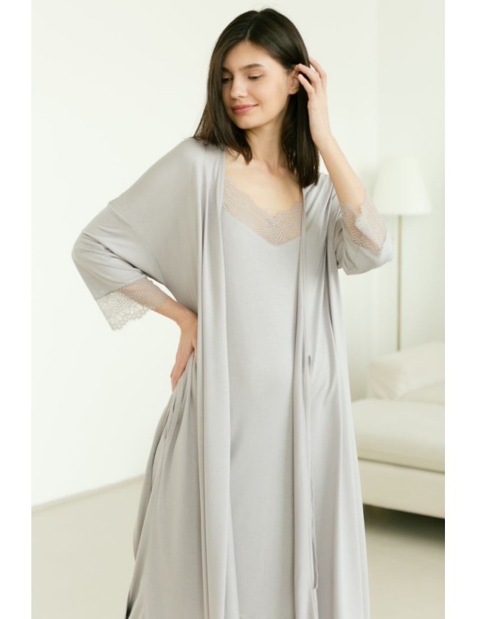 Халат – пеньюар классической длинны на запахе. Длина рукава 7/8. Рукав декорирован нежным кружевом.