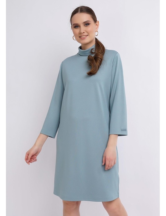 Платье умеренного объема из ткани джерси. Прямой силуэт, длиной ниже колена. По горловине стойка с отворотом, сзади застёжка на потайную молнию. Рукав втачной, длиной 7/8. Завершает дизайн пришивной декор.