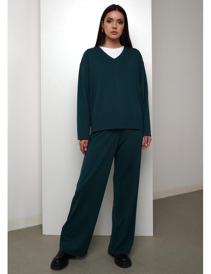 Брюки умеренного объёма прямые. Притачной пояс со шлевками. Функциональный гульфик с застежкой на молнию и пуговицу. По бокам карманы с отстрочкой. По спинке вытачки.