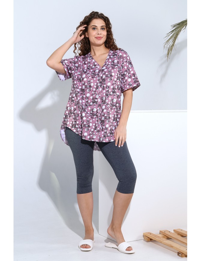 Из трикотажного полотна «кулирка» в комбинации двух видов в единой цветовой гамме: с набивным рисунком и гладкокрашеного, состоящий из туники и бриджей.