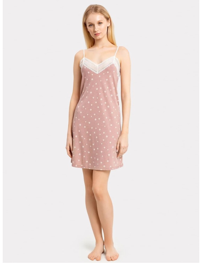 Топ полуприлегающего силуэта. Горловина V-образной формы. Верхний срез переда оформлен кружевом. Топ на бретелях, с регулировкой. Верхний срез спинки обработан в подгибку с эластичной тесьмой. Низ топа обработан швом вподгибку. Шорты свободного силуэта. Длина выше колен с цельнокроеным поясом, в поясе эластичная тесьма. Низ шорт обработан кружевом.