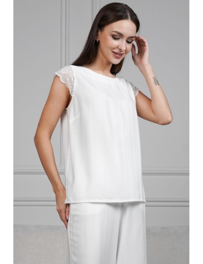Топ свободного прилегания с круглым вырезом горловины. Короткий рукав декорирован нежным кружевом. Разрезы по низу в боковых швах.