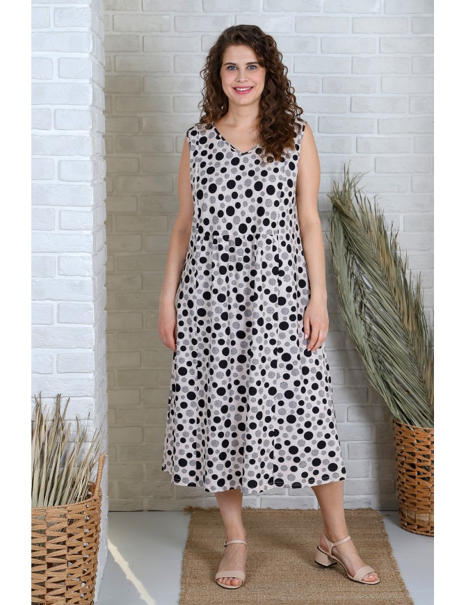 Сарафан из трикотажного полотна «кулирка» с набивным рисунком, слегка расширенный книзу, с расширенной и углубленной горловиной V-образной формы. Полочка – с рельефами, выходящими из плечевых швов. Центральная деталь – отрезная чуть выше линии талии. Нижняя часть центральной детали присборена по шву стачивания с верхней. Горловина и проймы окантованы основным материалом.
