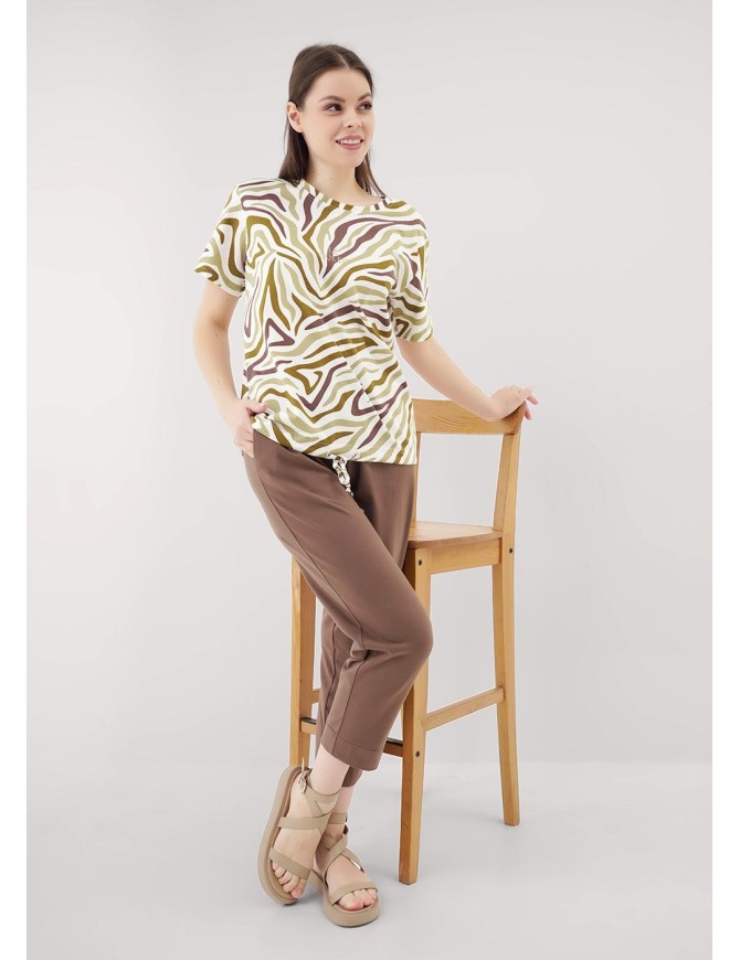 Набор одежды из хлопкового трикотажного полотна.Джемпер прямого силуэта,по талии кулиса со шнуром из окантовки. Втачной рукав.Горловина с обтачкой.Спереди термонашивка.Брюки длиной 7/8 с поясом на резинке.Боковые карманы с отрезным бочком,нашивка кокос.