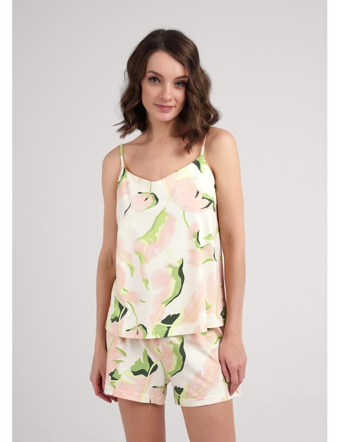 Пижама для дома и отдыха из хлопкового трикотажного полотна с добавлением модала. Майка с V-образным вырезом горловины. Узкая бретель с регулировкой длины. Горловина с внутренней обтачкой. Шорты с поясом на внутренней резинке.