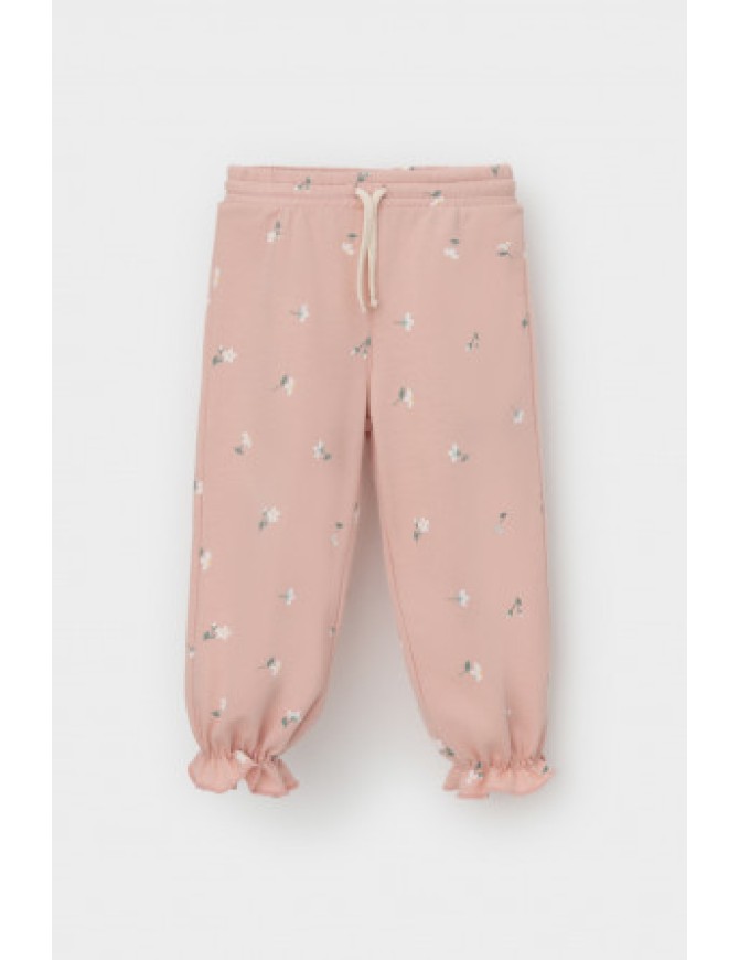 Трикотажные брюки для девочки из мягкого петельчатого футера. Пояс регулируется по ширине при помощи шнурка. Низ собран на резинку. Оригинальная набивка выполнена из стойких текстильных красителей. Изделие сохраняет цвет и форму после многократных стирок.
