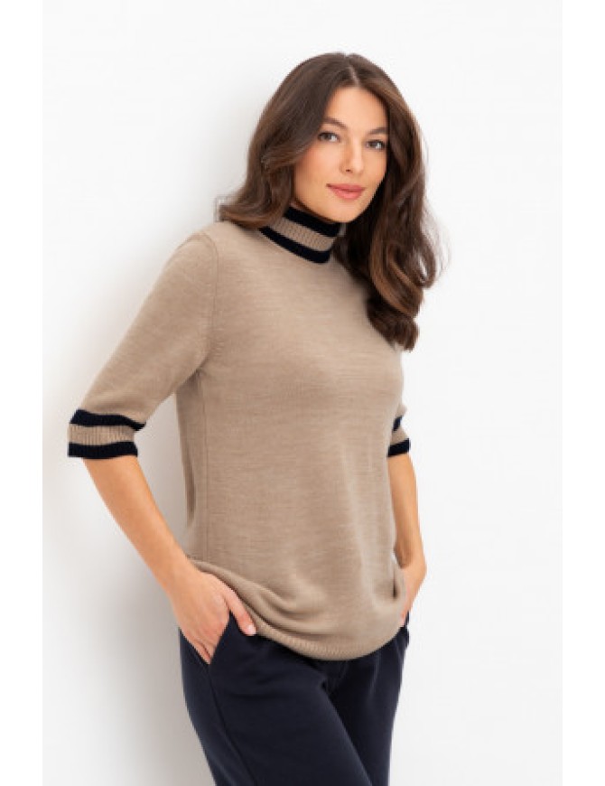 Джемпер в стиле прямой футболки, воротником-стойкой и короткими рукавами. Прямой силуэт, стандартная длина. Средняя плотность вязания, пластичная фактура. Выполнен гладью из мягкой полушерстяной пряжи. Шерсть в составе сохраняет тепло, а благодаря волокнам акрила изделие мягкое и дольше сохраняет форму.