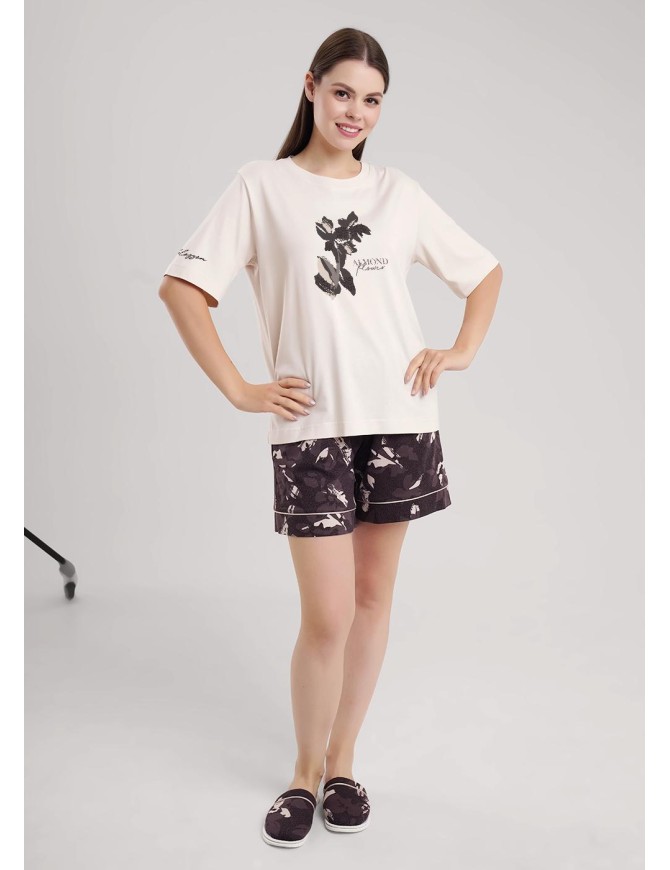 Набор одежды из трикотажного полотна с добавлением модала.Футболка прямого кроя,втачной короткий рукав. Округлая горловина с обтачкой.Спереди и по рукаву принт.Шорты с поясом на резинке, нашивка, по низу манжет с кантом.Боковые карманы с отрезным бочком.