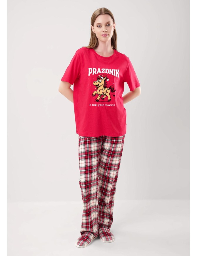 Пижама из хлопкового трикотажного полотна. Футболка прямого кроя. Короткий втачной рукав. Округлая горловина с обтачкой. Спереди принт. В боковом шве вшивка. Брюки из трикотажного полотна с карбоном прямые, пояс на внутренней резинке с киперной лентой.