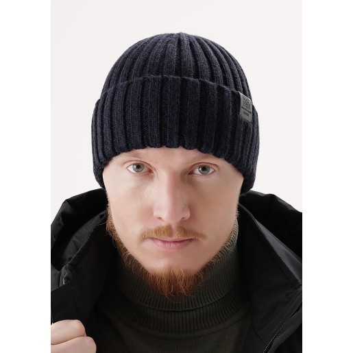 Мужская шапка из скрученой пряжи с отворотом, декорирована стильной нашивкой- логотип. Идеально подойдёт для холодной осени, тёплой зимы.