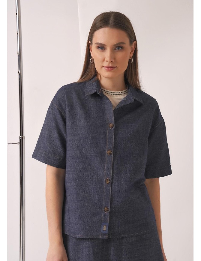 Блузка из текстильного полотна джинс, прямого силуэта. Отложной воротник со стойкой, по борту цельновыкроенная планка с пуговицами, внизу нашивка. Короткий рукав. На спинке кокетка.