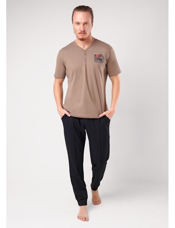 Набор, состоящий из футболки и брюк. Футболка из хлопкового фактурного полотна - флам, с коротким рукавом, имитацией планки, спереди авторский принт. Брюки из плотной кулирной глади на поясе с резинкой и регулируемым шнуром, по бокам удобные карманы.