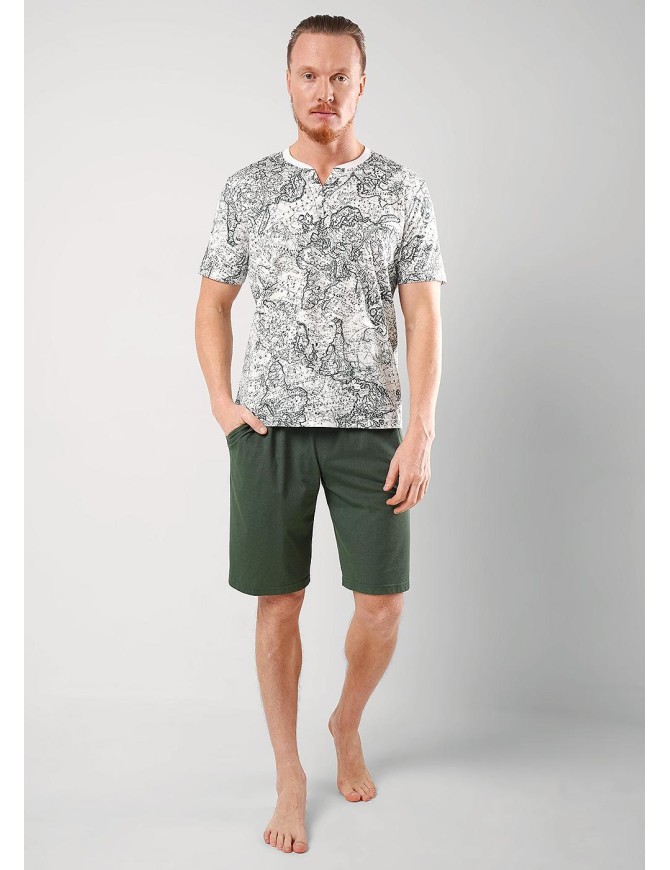 Набор мужской состоящий из футболки и шорт. Футболка из кулирной набивной глади с декоративной планкой на пуговицы. Шорты из фактурного полотна - "пике" на широком поясе с резинкой и регулируемым шнуром, по бокам удобные карманы.
