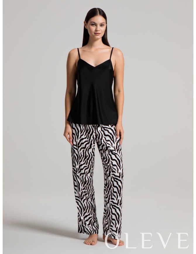 Пижамный комплект с брюками и топом. Бретели топа регулируются. Прямые брюки на эластичном поясе с завязками. Карманы в боковых швах.