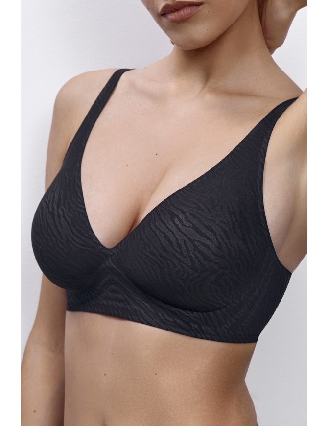 Бесшовный бюстгальтер из микрофибры с выраженной зоной декольте. Силиконовые вставки выполняют функции косточек.