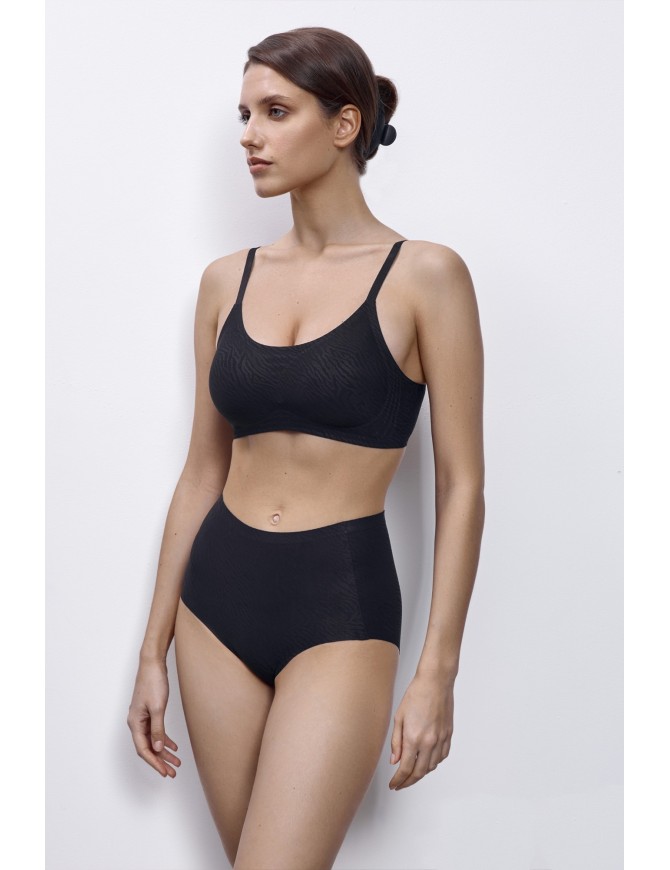 Бесшовный бюстгальтер в виде топа, из микрофибры. Силиконовые вставки для лучшей поддержки груди. Жаккардовая фактура с принтом "зебра". Спинка в форме "леотард". U-образный крой спинки, известный как "леотард", позволяет уменьшить складки на спине и помогает избегать самопроизвольного соскальзывания бретели с плеча, в силу того, что они расположены под углом друг к другу с максимальным сближением.