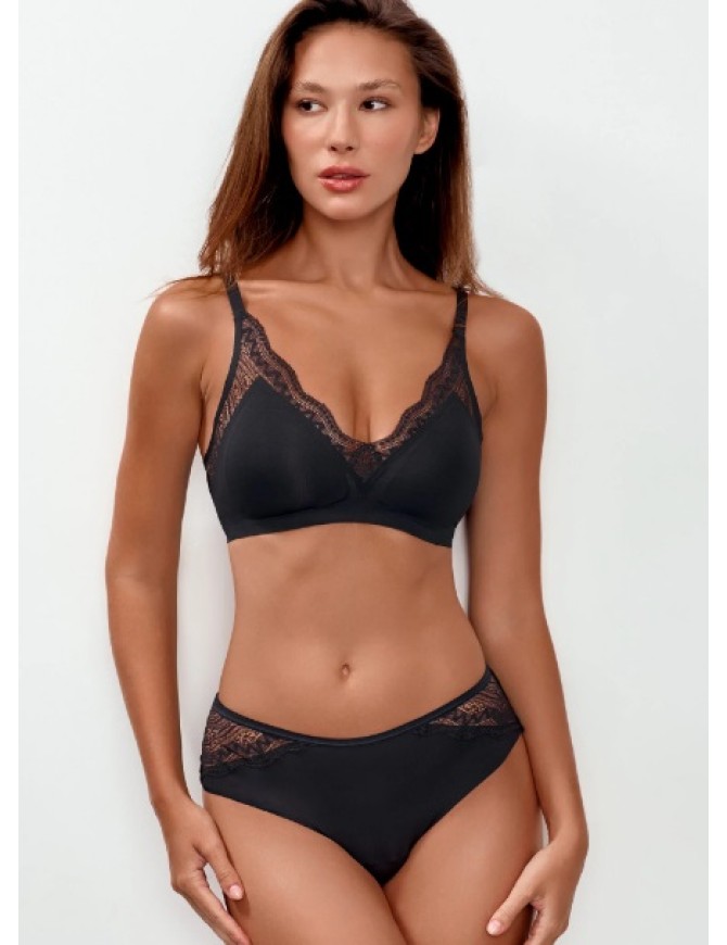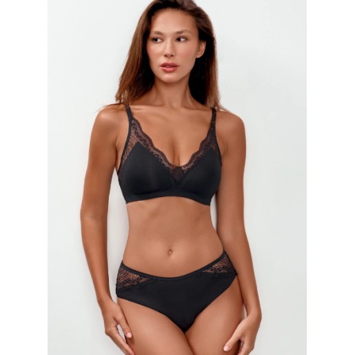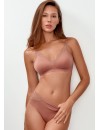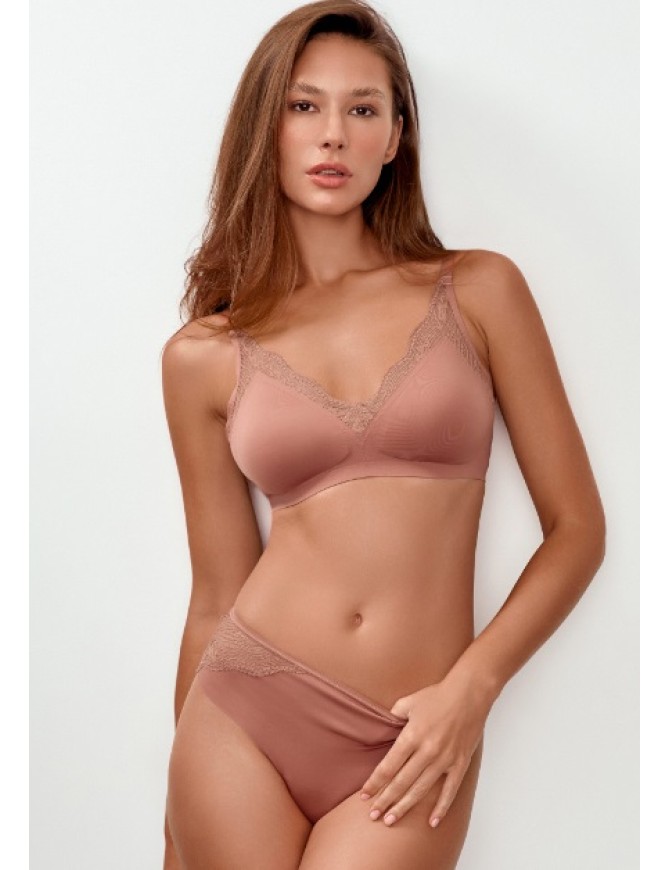 Бесшовный бюстгальтер из микрофибры, декорированный деликатным кружевом и сеткой по спинке изделия.