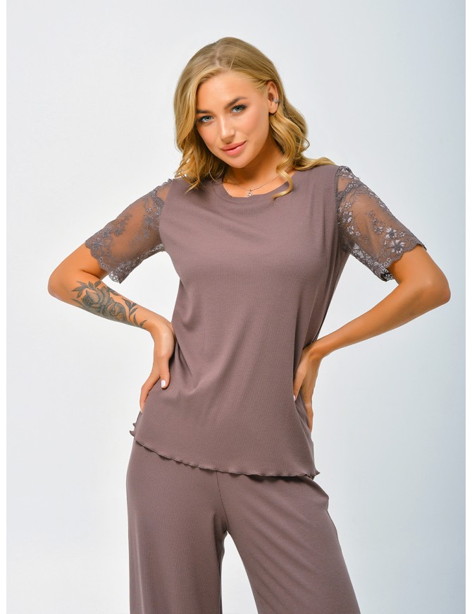 Классическая модель базовой футболки с короткими кружевными рукавами. Изящные линии модели, кружевные рукава делают повседневный стиль оригинальным и женственным.