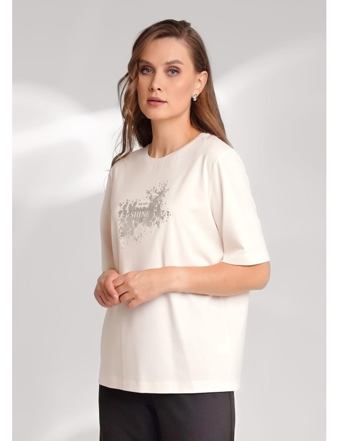Футболка прямого кроя из поливискозного трикотажного полотна интерлок. Короткий втачной рукав. Округлая горловина с обтачкой. Спереди термопайетки.