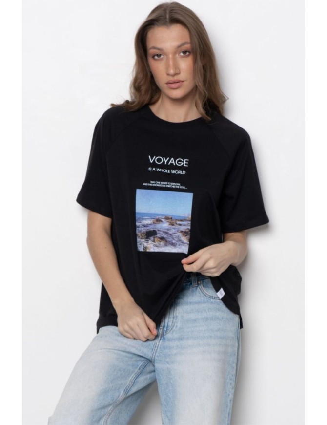 Футболка свободного прилегания с рукавом реглан. Вырез горловины круглый.